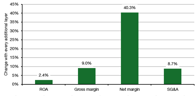 So, what’s the bottom line? How does the number of layers in a company affect profitability and other metrics? Here you can see the impact of each additional organizational layer on ROA, gross and net margin, as well as administrative costs (SG&A costs). I should mention here that this measures the change in these metrics for each layer measured on a log scale, but let’s ignore that technical aspect for now.