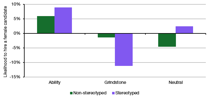 The graph below shows the differences in the probability to hire a female candidate by recruiters who showed stereotypical beliefs that women distinguish themselves more through hard work instead of innate capacity, compared to recruiters who do not show this kind of stereotypical behavior. If you are a female candidate who applies for a job with a grindstone recommendation letter and a recruiter with stereotypical views that you evaluate, you are much less likely to get the job.