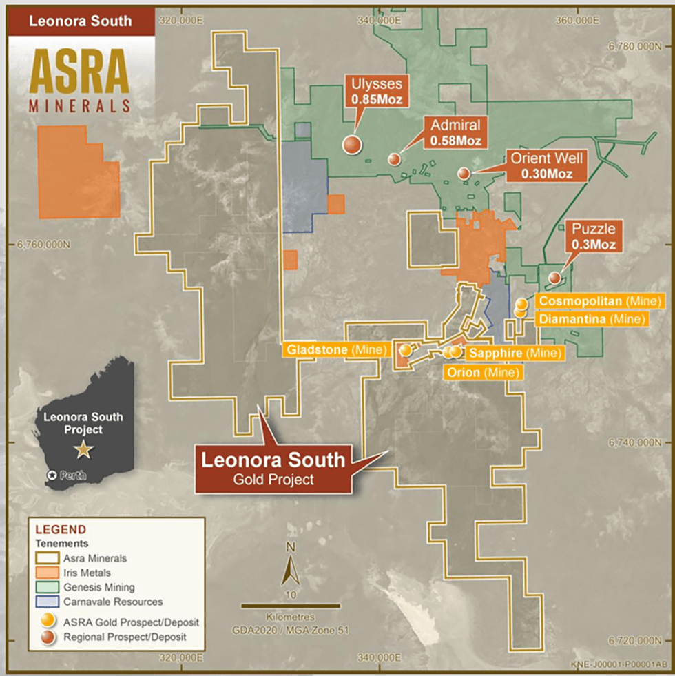 The Leonora South Project is 549 km² with eight granted mine rental contracts, located in the historic Kookynie Goldfields. This area is host for numerous high-quality deposits, including the Ulysses-Hub of Genesis Minerals (~ 2 MOZ Gold). ASRA is aimed at the open pit deposits of the sapphire and orion, which together have derived a Jorc 2012 from 48,014 OZ assessment with 2.2 grams per tonne (G/T) gold. High-quality interceptions include striking results such as 166 g/t gold over 6 m of 135 m, including 248.8 g/t gold of more than 4 m (sapphire) and 46.4 g/t gold over 4 m of 3 m (Orion), which demonstrates a potentially for Bonanza quality extensions at depth.