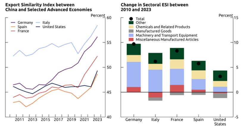From a global perspective, however, it was mainly the heart of Europe that lost when the Chinese market share increased. These countries have certainly lost much more than the US. To see why, we can look at Santacreu’s calculation of the export similarity index between China and other major exporters. This index measures how closely China’s exports, sector by sector, resemble those of another country.