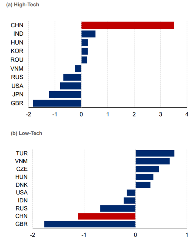 For the EU the picture is more complicated. Certainly, the two big losers were Russia and Britain, the former because of the invasion of Ukraine, the latter because of Brexit. However, keep in mind that the Chinese stock moved in opposite directions depending on the type of goods you look at. European companies import fewer low-tech goods from China than before and have increasingly replaced Chinese supplies with goods from Turkey, Vietnam and within the EU (Czech Republic, Hungary, Denmark).