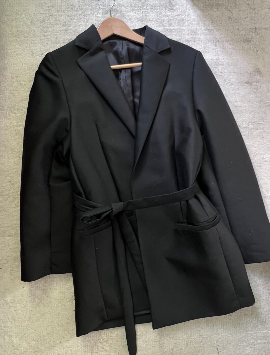 Sell a favorite. Made from a woolen mixture, this blazer has a classic satin, side pockets and a satin belt to bind.