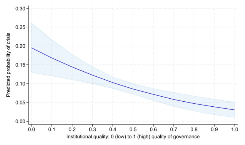 Furthermore, the authors attempted to estimate the likelihood of an economic crisis based on the quality of governance in a region. The graph at the bottom shows the probability of a region experiencing a sharp decline in GDP per capita, i.e. in the 10% worst declines ever measured as a function of the quality of governance. Such a sharp decline in GDP per capita is very unlikely (around 2.5%) in regions with strong governance, but increases to almost 20% for the worst governed regions.