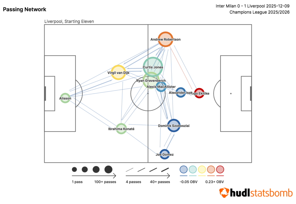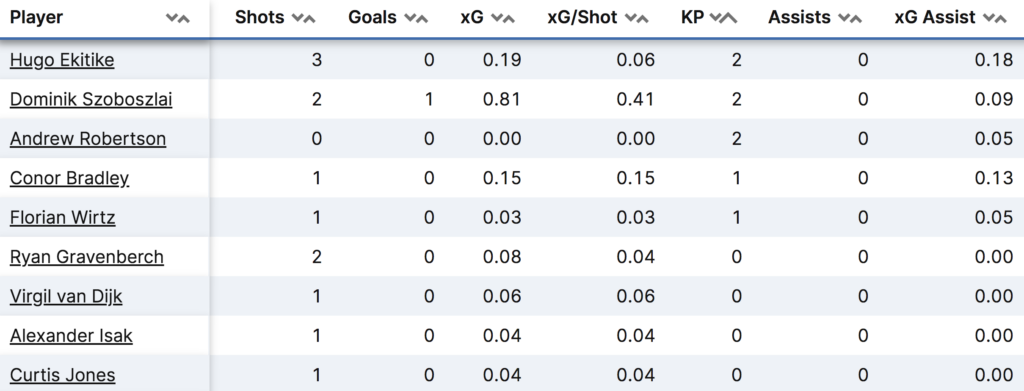 Szoboszlai, who notably acted to convert Liverpool’s late penalty (with Isak off the pitch we should add), provided energy on the right side of the diamond, with two shots and two key passes.