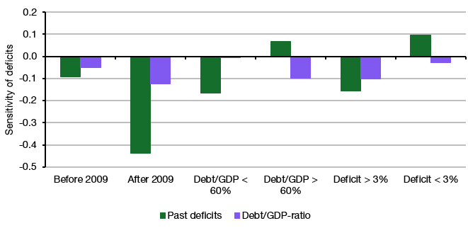 The European debt crisis has indeed done a lot of good things in the eurozone countries afterwards. The graph below shows the tax response function of countries in the eurozone for deficits in the past and debt-to-BP levels. The way to interpret these figures is that a negative number indicates that deficits have been reduced after an increase in deficits or debt levels in the past. The value itself gives you an idea of how much the deficit changes for an increase of 1% in earlier deficits or debt levels.