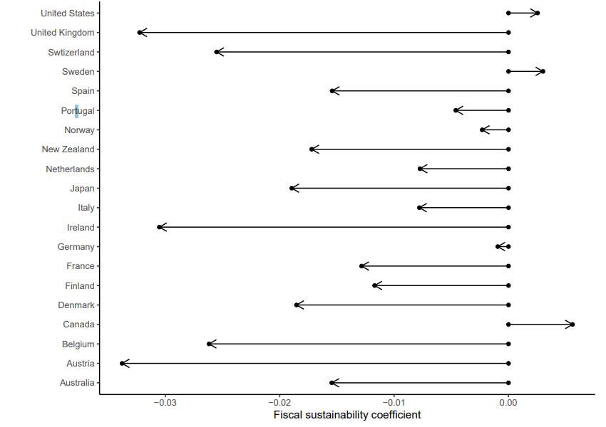 Instead, I want to contrast the tax responsibility of countries of the eurozone with those of the US. A few months ago, I wrote about another study Through the same authors, who investigated the tax response in the 19 largest economies. A graph that I did not shown last time is that below. It shows how tax responsiveness between 2000 and 2020 has changed by the country. As you can see, all Member States of the eurozone have become more tax -responsible (except Germany, which will probably become even more responsible than it was always). But the US, Canada and Sweden went the other way.