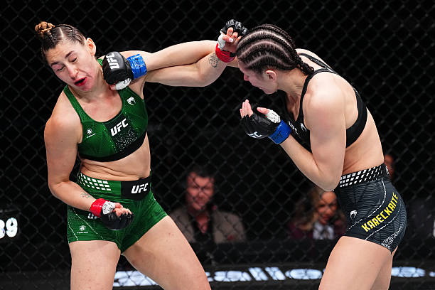 Once back in the center of the Octagonit turned into a battle of wills as both fighters threw shots with reckless abandon. Kareckaite landed quite a few shots that left Tarin’s jaw dropping, but it was Tarin’s non-stop onslaught of uppercuts and a flurry in the final ten seconds that moved the scorecards in her favor.