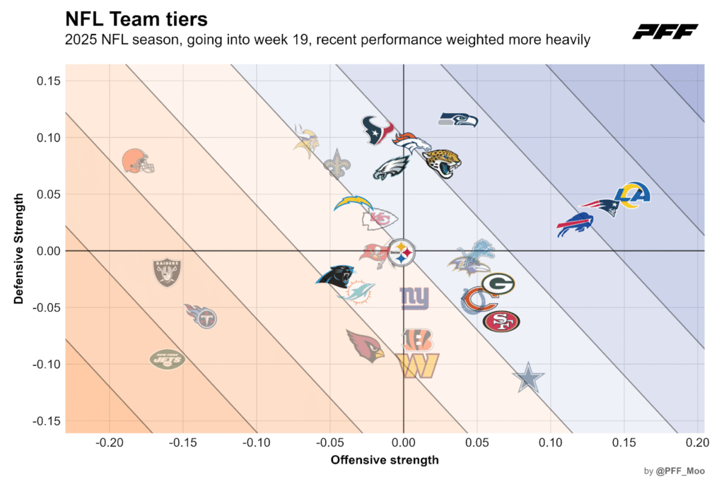 The following chart groups teams by expected points added per game. To improve predictive power, high-leverage plays such as turnovers and goal-line plays are weighted down slightly. In addition, team strengths take opponents into account and recent performances count more heavily in team strength estimates than performances earlier in the season.
