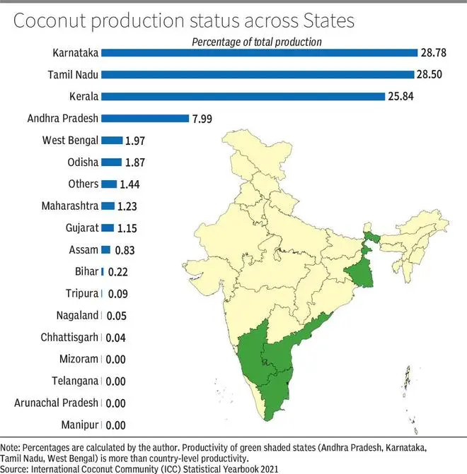 Production data indicate a strong regional concentration. Karnataka, Tamil Nadu and Kerala together account for more than 80 percent of India’s coconut production (see figure). Andhra Pradesh and West Bengal are also major contributors. The green shaded states (Andhra Pradesh, Karnataka, Tamil Nadu, West Bengal) record productivity levels higher than the national average. Higher productivity means faster income gains. It also strengthens India’s position in the global coconut markets. Thus, these four states can gain a clear advantage by taking advantage of the replanting and technological support announced in the budget.