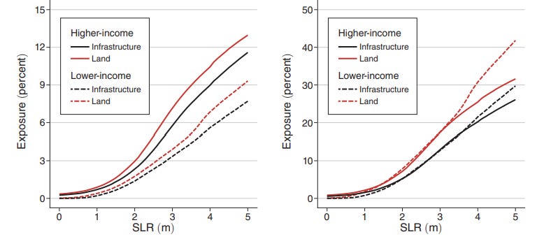 However, if our predictions are too pessimistic and we come to the tail ends of the forecast of the sea level rise, for example, because we are not on our way to decipher the economy or because of the tipping point effects that cause an accelerated melting of polar ice caps, we are in trouble. The graphs below show that damage to land and infrastructure starts to speed up quickly as soon as the sea level rise is greater than 2 m.
