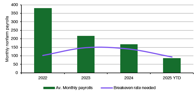 Eat how much has calculated how many new jobs the US economy must create each month to keep unemployment stable. As long as monthly nonfarm wage wages are above this breakeven rate, the unemployment rate will remain stable or decline (assuming stable labor market participation). If nonfarm payrolls fall below that breakeven level, unemployment will begin to rise. The chart below shows that the U.S. needed to add about 120,000 to 160,000 jobs each month in 2023 and 2024 as a result of accelerated growth in the working-age population. But by June 2025, the required number of jobs had fallen to 86,000.