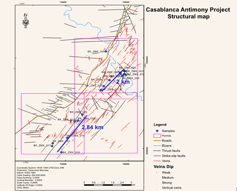 - Casablanca Antimony Project: Six exploratory licenses of more than 79 km² in Central Morocco. Surface -sampling during the necessary diligence returned amazing results: up to 61.9 percent antimony, with extra samples ranging from 7.8 to 46.52 percent antimoon along a strike of more than 4 km.